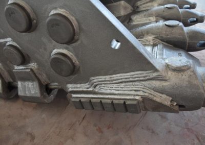 Strategic placement of JFE450/500 LE wear material in the cutting edge, side blades and bottom corner to reduce wear