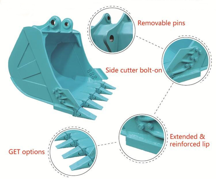 Bolt-On Cutting Edge or Teeth Optional Bucket Pins: Equal to AISI 4140 Chrome Bolts & Nuts: Level 12.9